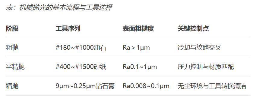 盡管存在多種拋光方法(化學(xué)拋光、電解拋光、超聲波拋光等),但精密模具的鏡面加工仍以機械拋光為主。原因在于其能同時保證幾何精度與表面質(zhì)量。機械拋光的核心在于分階段遞進式處理: